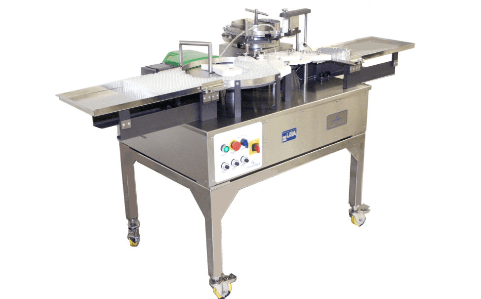 The Model FS-2205 (Fill & Stopper) is also available for Filling, Stoppering & AL Sealing applications. This is our Model FSAS-2205, which allows you have a single compact monoblock machine to perform all three operations.