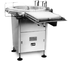 Our Model 24-U stainless steel rotary unscrambler handles round bottles and vials of every type, diverting them single file via guide rails to filling, stoppering or other equipment.