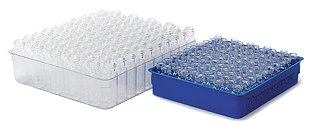 The robot arm picks up one row of vials by the vial body and moves forward over the tray to the last row in the tray and lowers the vials into the individual pockets in the tray. Loading starts at the rear of the tray and indexes one row forward until all rows are filled. At that time, the filled tray shuttles and a new tray is presented to the loading station where the loading cycle begins again.